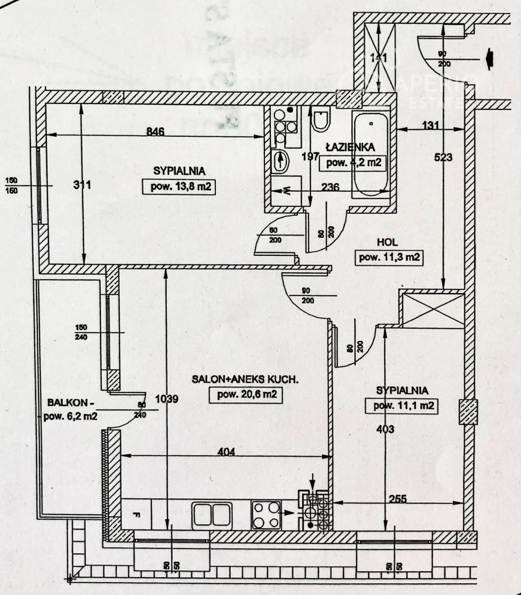 - salonu połączonego z kuchnią oraz wyjściem na duży balkon,